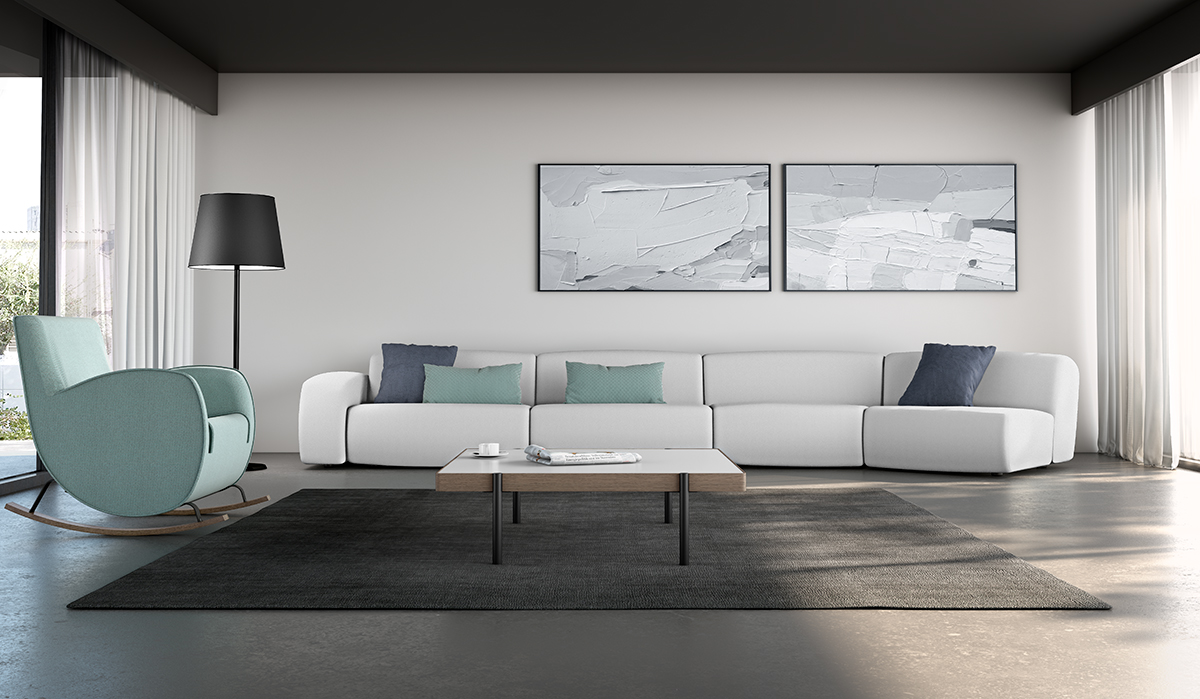 Armchair for any space in the home, or for a public space where you want comfort and elegance to prevail. Smooth curves that end in its two possible standing versions, with fixed or rocker legs.